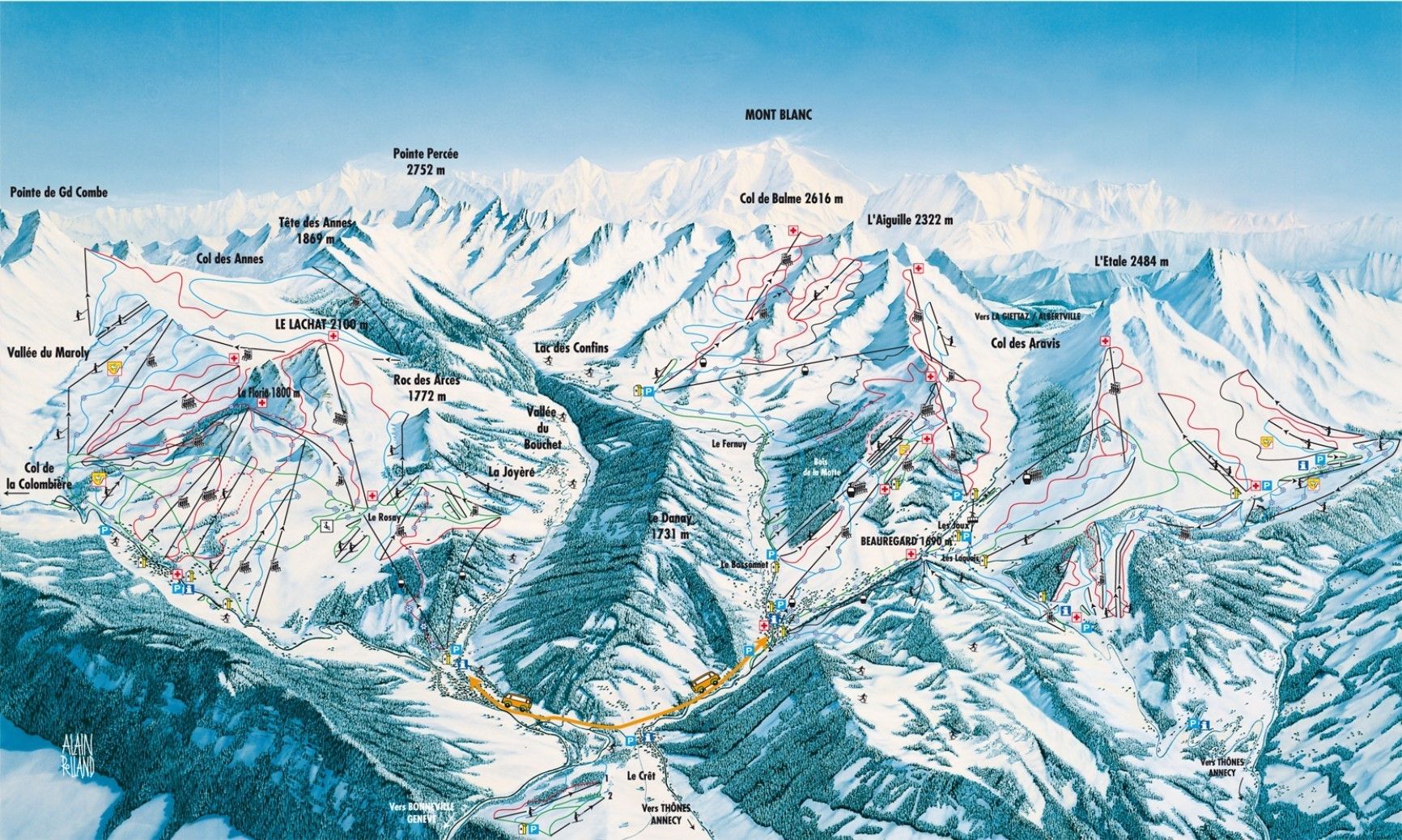 Podczas gdy mały teren narciarski Sain Jean de Sixt posiada ejdynie 5 nartostrad przede wszystkim nadających się dla początkujących, to pozostałe dwa tereny mogą poszczycić się zarówno łatwymi trasami, jak i tymi dla zaawansowanych. Głównie na terenach Le Grand Bornand rodziny i początkujący mogą szusować na niebieskich i czerwonych nartostradach. Lecz także czarne nartostrady, jak np. trasa z muldami "Mur de Lachet" uzupełniają ofertę. Teren narciarski Le Clusaz natomiast doskonale nadaje się dla freeridowców, a jednocześnie pochodzi stąd wielu znanych freestylowców. Miejscowość ta odznaczona została również znakiem jakości "Familie Plus". Tereny narciarskie połączone są ze sobą autobusem dla narciarzy.