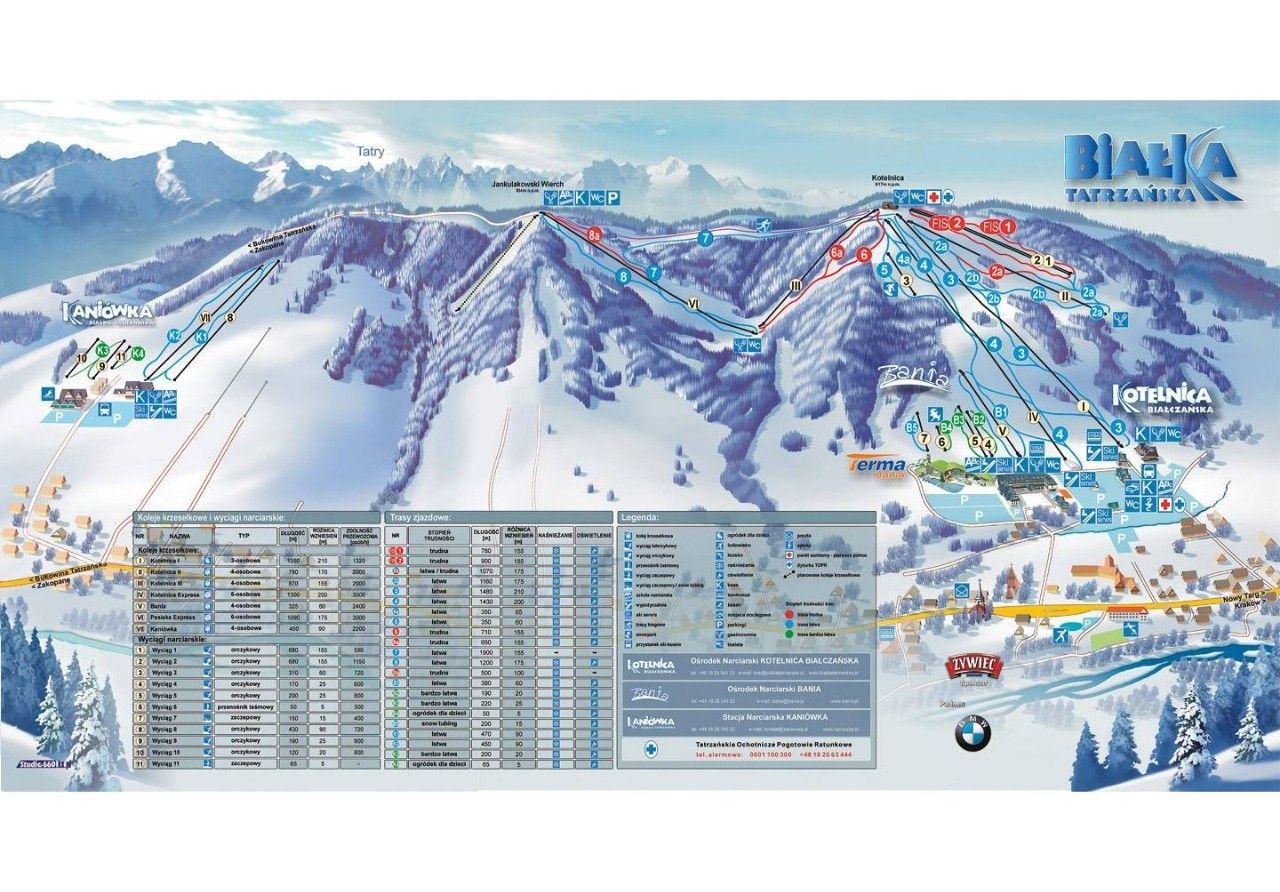 Trzy tereny narciarskie Białki Tatrzańskiej cechują się przede wszystkim szerokimi i łagodnymi zboczami oraz przepięknymi i malowniczymi trasami pomiędzy drzewami. Nieco trudniejsze, częściowo spełniające wymagania FIS trasy narciarskie znajdą Państwo na Kotelnicy. Bania natomiast to optymalny teren dla rodzin z dziećmi: 3 wyciągi dla maluchów i początkujących, przedszkole narciarskie z „dmuchańców” i zimowa karuzela dla najmłodszych. Najmłodsi wyszaleć się tu mogą także na torze snowtubingowym jeżdżąc na „oponkach”. Szkółka narciarska i wypożyczalnia sprzętu narciarskiego położone są bezpośrednio na trasie narciarskiej, tak jak liczne regionalne karczmy i bacówki. Oświetlone nartostrady pozwalają „nocnym Markom” szusować do godziny 22:00.